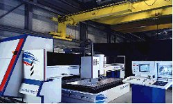 MG Systems 产品 Lasermat激光切割系统 Lasermat为大型激光切割机,具有加工工作区域大,具备多种加工方式,以及切割质量优良的特点。该机特别适合需要高生产能力的场合。该机型是目前大型激光切割机中切割速度最快的。 该系统具有以下特点,可显著提高生产效率: 切割定位速度高达166 英尺/分(50m/min) 加速度16英尺/秒2(4.8m/sec2) 优化的切割工艺 激光源固定在系统车架上,使激光束与系统一起作纵向运动。横向激光束通过一运动反射镜反射到切割头进行聚焦。采用这样的结构可缩短光路长度,扩大工作台面。 切割范围 宽度: 8.2, 10.5 and 13.8 英尺(2.5 m、3.2m 及4.2m) 长度: 13 至 98英尺(3.9m 至29.7m) 切割方式 GE Fanuc CO2 高速轴流式激光器,输出功率 3kw, 4kw及6kw Hypertherm 等离子HT2000或 Ht4400 板材标记装置 厚度 0.03-1.25英寸(7.6-31.8mm) 精度 典型值+/- 0.004 英寸 (+/-0.1mm) 材质 碳钢、不锈钢及铝材 数控类型 GE Fanuc 160iL